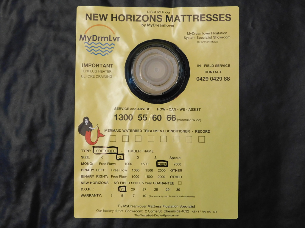 NEW HORIZONS WATERBED BLADDER RELEASE - NO FIBER SHIFT - WRITTEN GUARANTEE - ON THE VALVE TAG